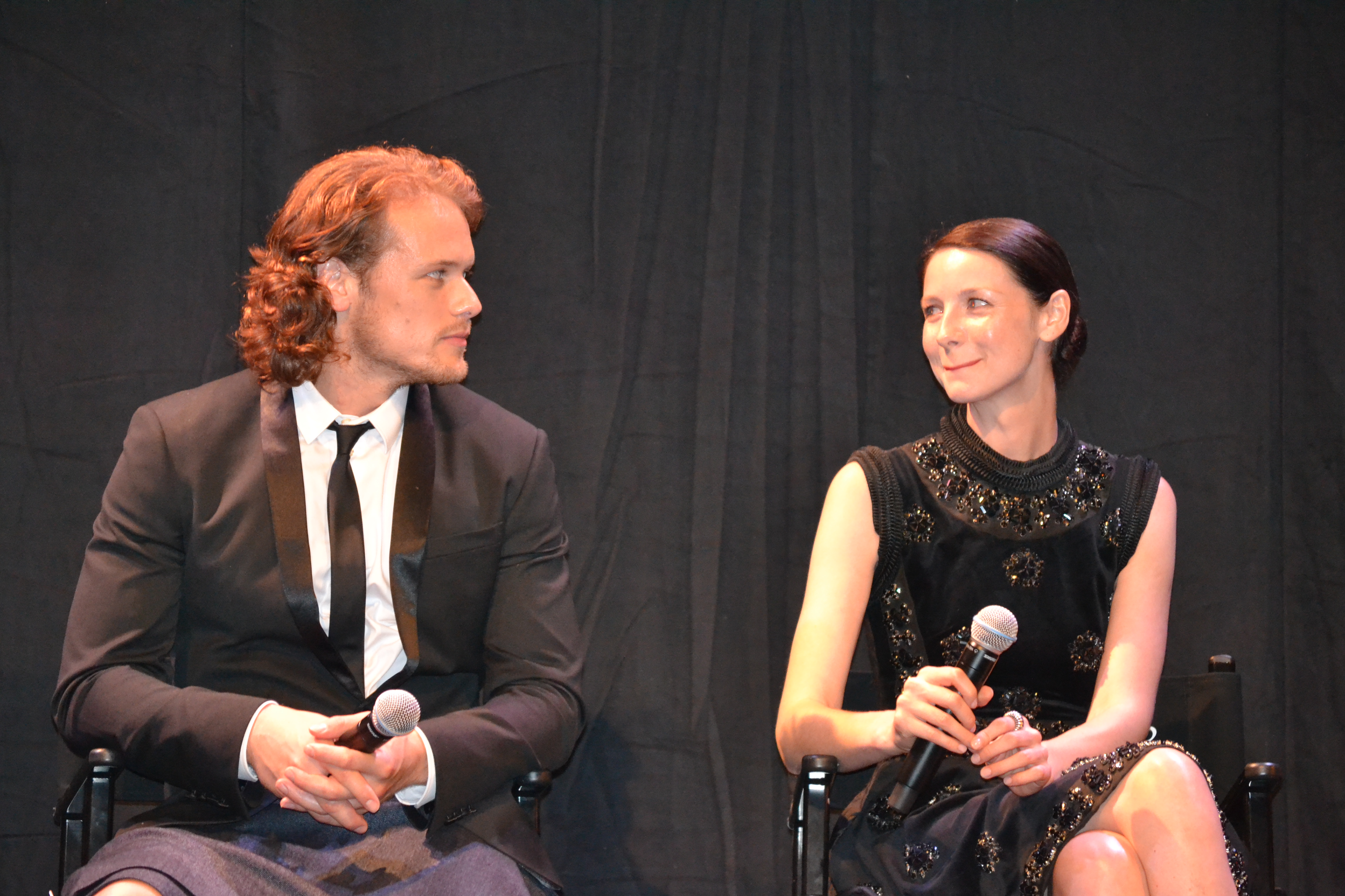 Now that I’ve come out of my Comic-Con haze, I’ve created a new gallery of all of my photos from Friday’s event. In the gallery below you’ll find all of my pics from the red carpet (or should we say tartan carpet) premiere, followed by the cast Q&A session with Sam, Cait, Lotte, Graham, Tobias, Diana, and Ron. The cast rolled up to the tartan carpet in classic 1940s cars, and followed bagpipers and lads in kilts onto the press line. After we had our chance to chat with the cast and crew, we all went inside the theatre and were treated to a performance by composer Bear McCreary, who played some classic Scottish tunes and debuted the theme he wrote for Claire and Jamie. Seeing the first episode on the big screen was truly a remarkable experience, and I I think it’s safe to say that I wasn’t the only one in the audience with goosebumps and a lump in their throat. The first episode was everything I could hope for (the second, which I screened before the premiere, is just as good, but that’s all I’ll say for now). I don’t think you will be disappointed with the show. Starz and the cast and crew have done an amazing job, and it’s everything I could hope for and more. Hope you enjoy the pics from this very epic night!